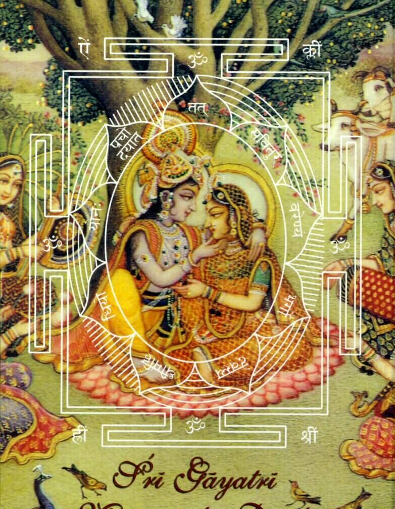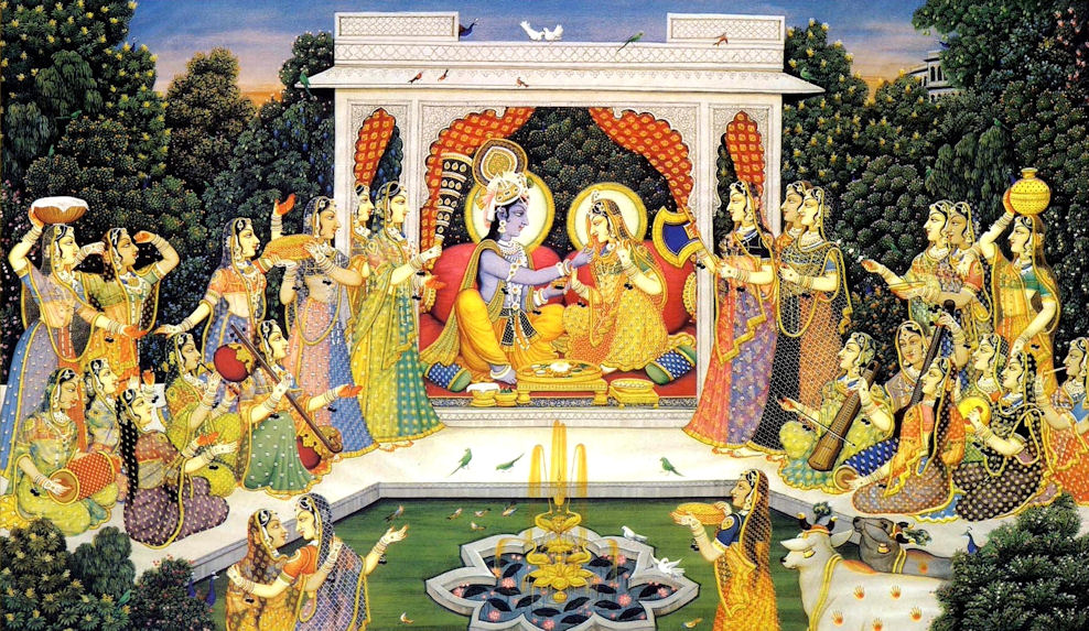 Just as the Divine Couple have Their deep tattvas, their 8-fold daily pastimes also embody the different rasa-tattva moods and different ‘colours’ of the day. Thus, eternal variety allows Sri Radha to change Her dress for different lilas, including the pastime of dressing up as Her brother Sridama!